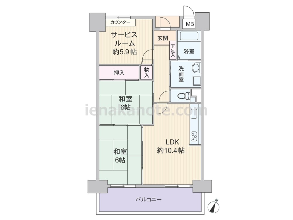 専有面積61.04平米の2SLDK。LDK、和室をぐるりと回遊できるプラン。和室2間、リビングと和室が続き間になっており、ライフシーンにあわせて間取りをフレキシブルに変更できます。サービスルームにはカウンター付きで、収納部屋としても、書斎や子供部屋としても使えます。