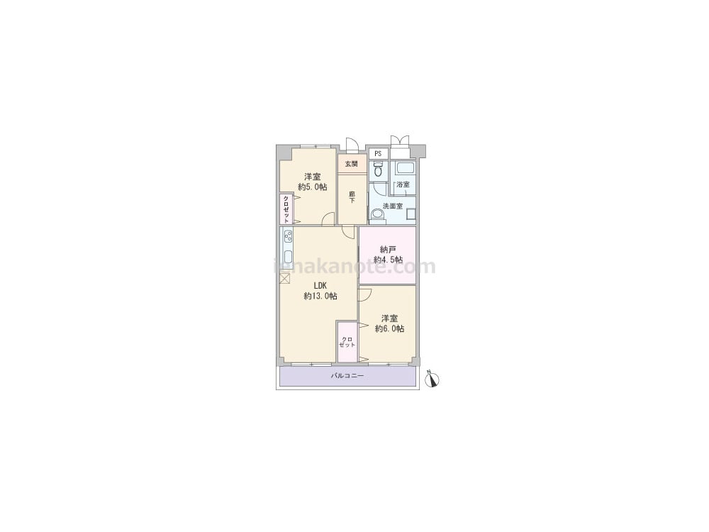 専有面積63.70平米の2SLDK。LDKは約13帖、キッチンはI型の壁付け・オープンタイプです。約4.5帖の納戸は収納としてはもちろん、書斎や趣味の部屋など様々な用途に使えます。どの部屋にも一度LDKを通ってから入る造りのため、自然と家族のコミュニケーションの機会が増えそうです。