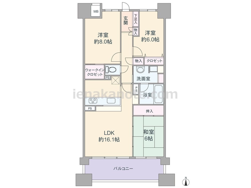 専有面積82.47平米の3LDK。全室6帖以上のゆとりがあるプラン。キッチンはカウンタータイプで、家事をしながら家族と会話を楽しめます。LDKには和室が隣接しており、扉を開放すれば約22.1帖の空間としても利用可能。主寝室約8帖はウォークインクロゼット付きです。南向きのバルコニーはゆとりがあり、ガーデニングをゆったり楽しめます。