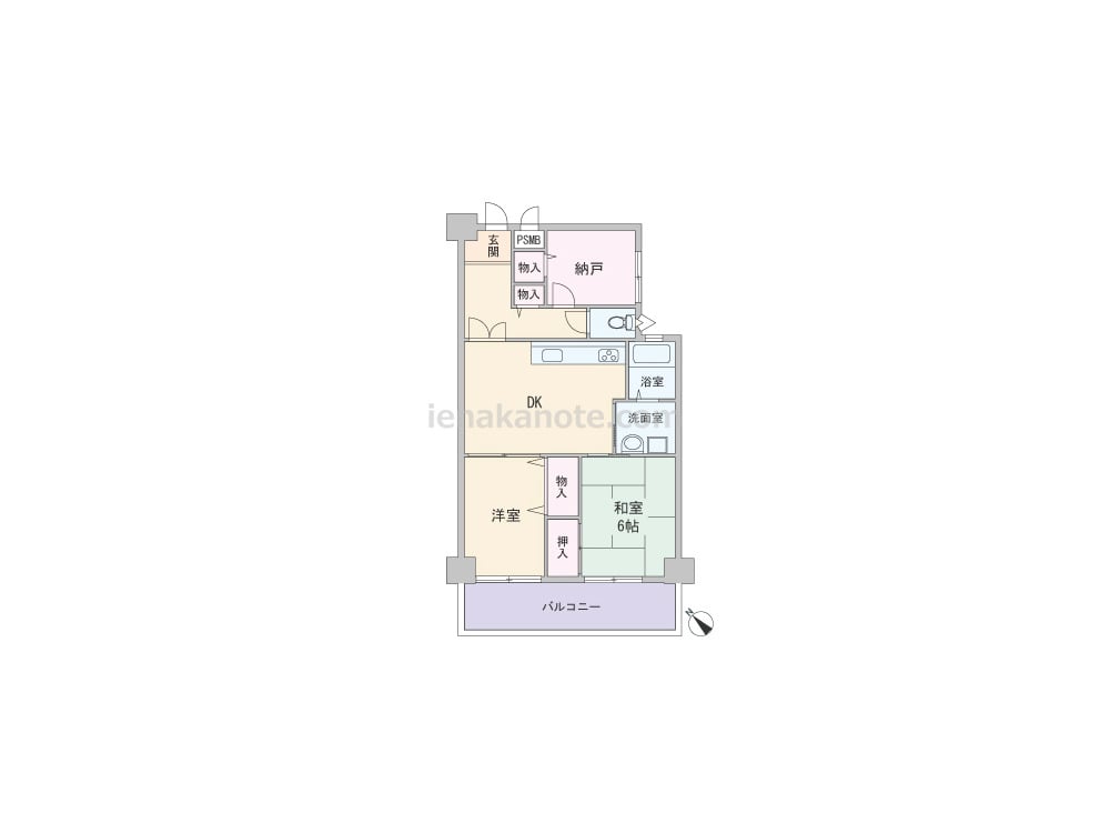 専有面積57.01平米の2SLDK。キッチンは壁付けのオープンタイプ。DKと続き間になった洋室は扉を開放してリビングスペースとして使うこともできます。各部屋に収納が設置されており、納戸は収納としてはもちろん、書斎や趣味のスペースとしても利用できそうです。浴室には窓があり、換気がしやすく快適です。