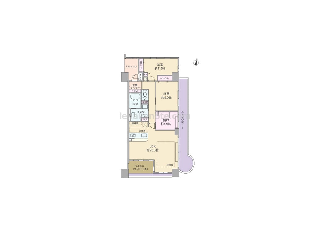 専有面積95.23平米の2SLDK。全室7帖以上のゆとりあるプラン。玄関前にはアルコーブ、バルコニーが2カ所あり、南側のバルコニーはウッドデッキ仕様です。約23.3帖大の広々としたLDKは、2面採光で明るく開放的。カウンタータイプのキッチンは家事をしながら家族とコミュニケーションが取りやすい配置。各所に収納が設けられ、約4.9帖の納戸は、収納スペースの利用はもちろん、ご主人の趣味の部屋や、奥様の家事室にもよさそうです。