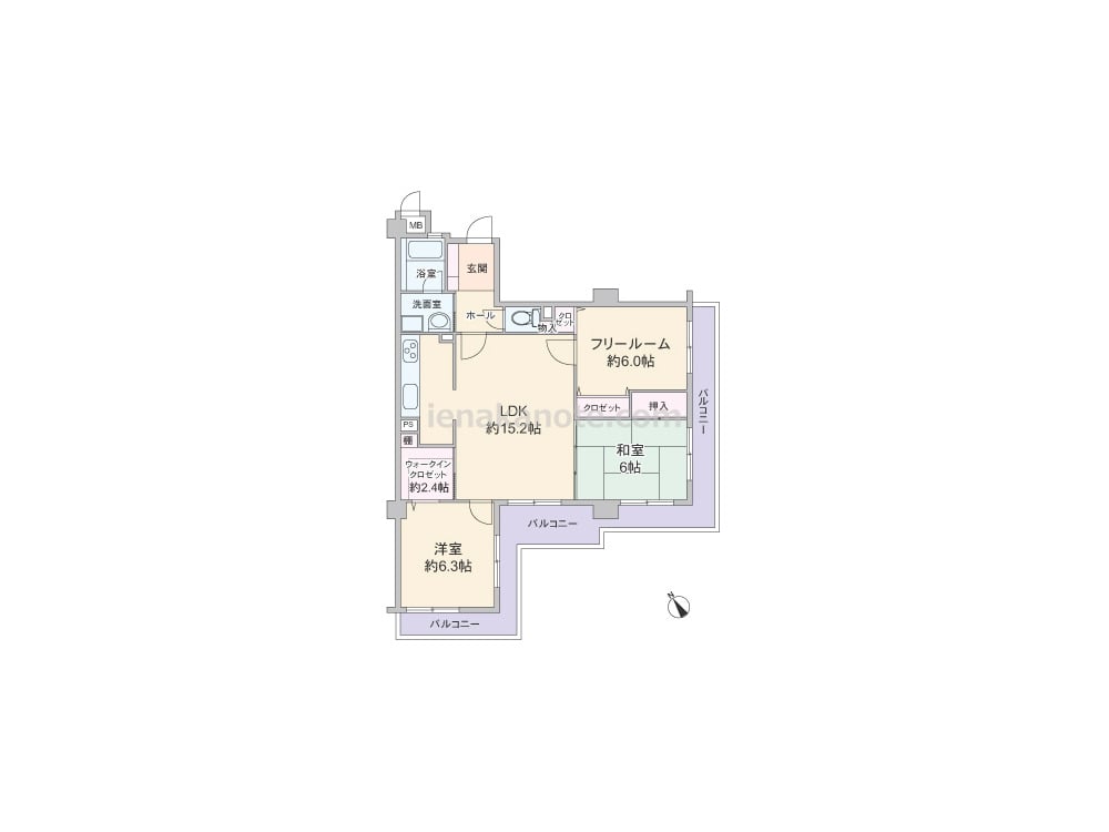 専有面積75.86平米の2SLDK。全部屋6帖以上+バルコニーに面した、明るさとゆとりのあるプラン。室内廊下の面積が少なく居室空間を優先した造り。各居室へはLDKを通ってアクセスするため家族のコミュニケーションが増えます。独立タイプのキッチンはリビングから見えにくく、生活感が出にくいのがポイント。約6.0帖のフリールームは洋室仕様+収納スペース付きのため、居室としても利用出来ます。主寝室約6.3帖には大容量のウォークインクロゼット付き。浴室の窓は換気がしやすく快適です。