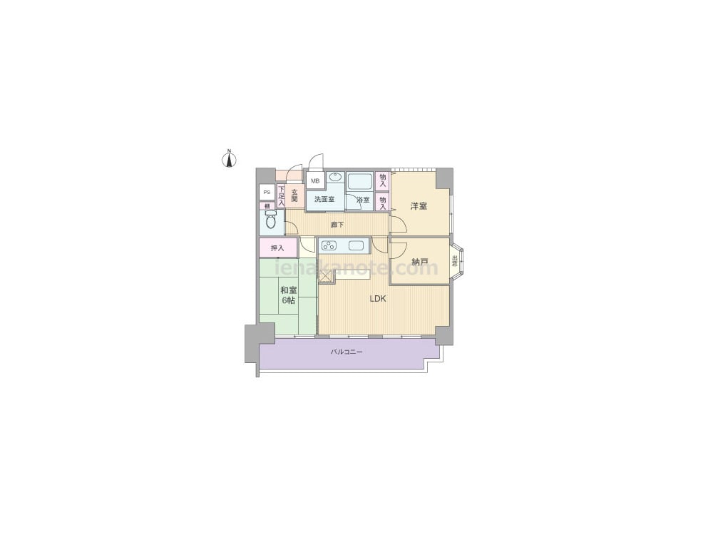 専有面積64.71平米の2SLDK。ワイドスパンのプラン。キッチンはI型・壁付けタイプで、作業時に便利なカウンター付き。和室6帖は室内廊下とLDKの2カ所から出入りが可能です。洋室はガラスブロックが用いられ、室内にはやわらかな光が入ります。納戸は居室としても利用できますが、収納スペースが無いため収納家具を置くなど少し工夫が必要。バルコニーは約12.23平米の広さがあり、ガーデニングを楽しむのにぴったりです。