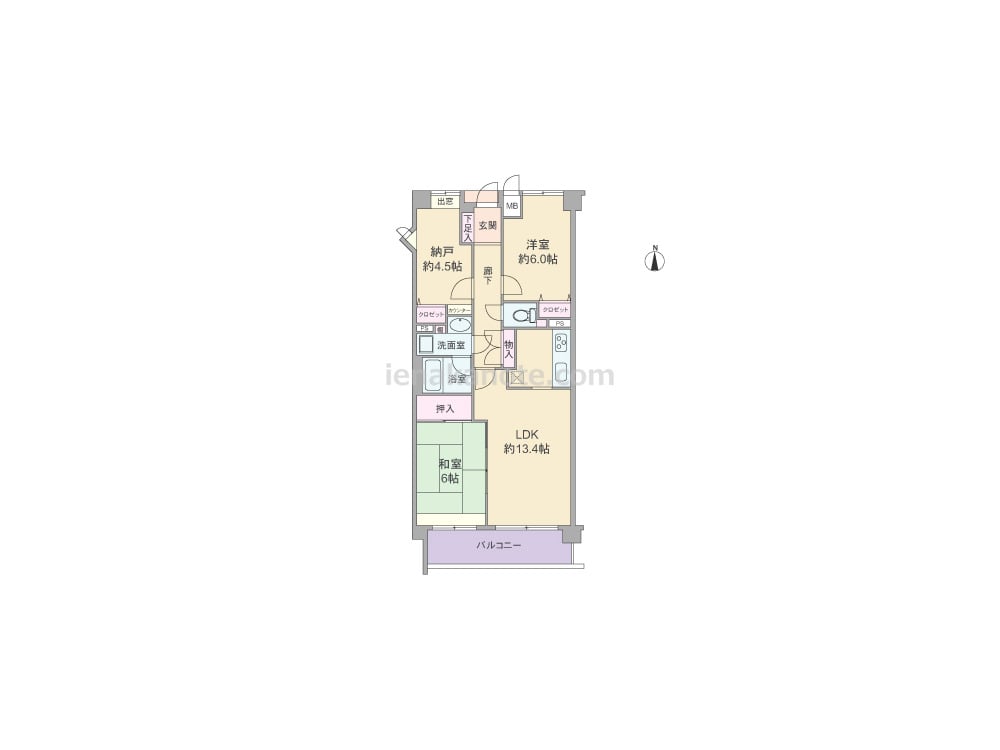 専有面積67.44平米の2SLDK。キッチンは独立タイプのため、リビングスペースはくつろぎの空間を演出できます。LDKに隣接する和室の襖を開放すれば、LDK約19.4帖大としても利用可能。各居室に収納スペースがあり、室内廊下にも物入付き。納戸約4.5帖は洋室仕様+収納スペース付きのため、居室としても十分に使用できます。