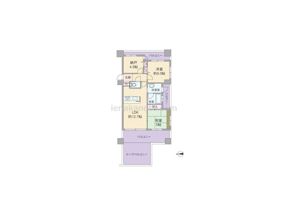 専有面積60.58平米の2SLDK。居室の窓が共用廊下に直接面していない、プライバシーを確保したプラン。LDK約12.7帖に隣接する和室の襖を開放すれば、約17.7帖大の空間としても使用出来ます。キッチンは作業中も家族と会話を楽しめる対面カウンタータイプ。洗面室にはバルコニーへの勝手口があり、浴室の窓は換気がしやすく快適です。洋室仕様の納戸約4.5帖は、書斎や子供部屋などの利用によさそう。バルコニー3カ所+ルーフバルコニーも付いており、テーブルセットを置いてアウトドアリビングにしたり、ガーデニングや家庭菜園もたっぷり楽しめます。