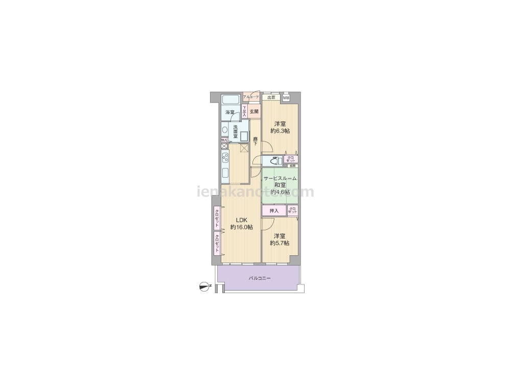 専有面積72.22平米の2SLDK。LDK約16.0帖にはクロゼットが2カ所あり、生活感の出やすいキッチンは独立型のため、リビング・ダイニングはくつろぎの空間を演出できます。キッチンは洗面室へ行き来が可能な2WAY動線。和室仕様のサービスルームは、小さい子供の遊び場やお昼寝スペースにしたり、くつろぎのリビングスペースにするなど、生活シーンに合わせて多目的に使えます。洋室約5.7帖はLDKを通って出入りするため、子供部屋に利用すれば家族のコミュニケーションの機会が増え安心です。