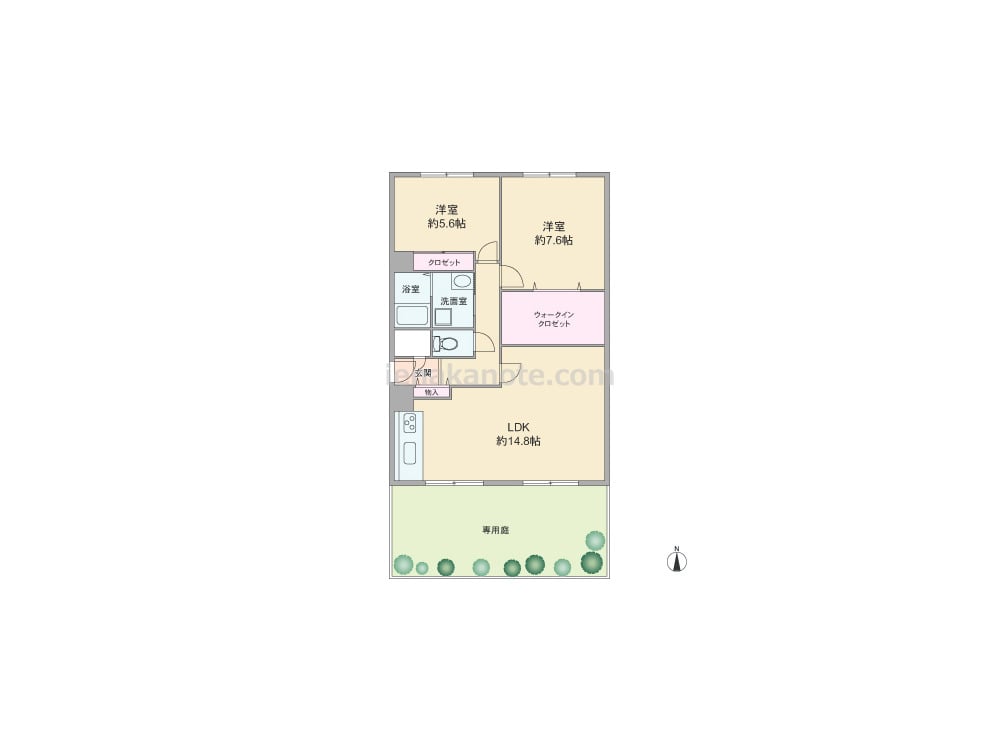 専有面積71.08平米の2SLDK。専用庭付きのプラン。玄関扉は内開きのため玄関スペースは限られますが、防犯面では安心です。LDKは約14.8帖、キッチンは壁付け・オープンタイプ。主寝室約7.6帖には大容量のウォークインクロゼット付き。専用庭は約25.0平米と広く、ガーデニングを楽しんだり、テーブルセットを置いてアウトドアリビングとしても空間を楽しめます。