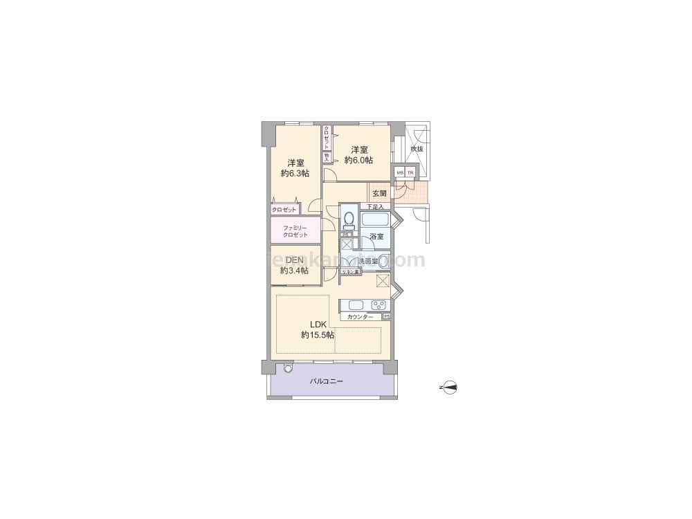 専有面積78.5平米の2SLDK。LDK約15.5帖と続き間のDEN約3.4帖は、納戸や家事室、書斎や趣味の部屋など色々な用途に利用できます。対面カウンタータイプのキッチンは、洗面室へもアクセス可能な家事効率の良い造り。キッチン横と浴室に出窓があります。大容量のファミリークロゼットや玄関前にトランクルームがあるなど、収納スペースも充実。バルコニー約11.79平米にはスロップシンクが付いています。
