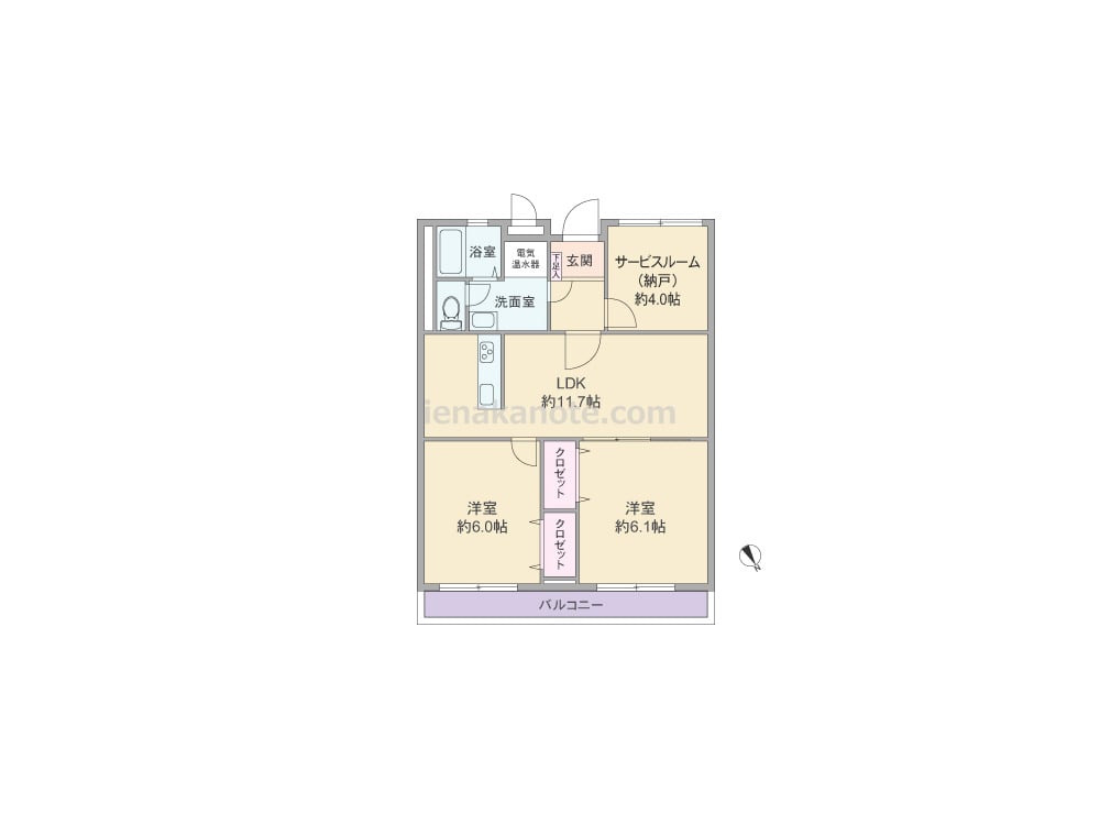 専有面積64.80平米の2SLDK。センターリビングのプラン。洋室約6.0帖、洋室約6.1帖はLDK約11.7帖を通って行き来します。洋室仕様のサービスルーム約4.0帖は、書斎、ホビールーム、収納スペースなど色々な用途に使用可能。トイレは洗面室を通って出入りし、浴室には換気に配慮された窓があります。