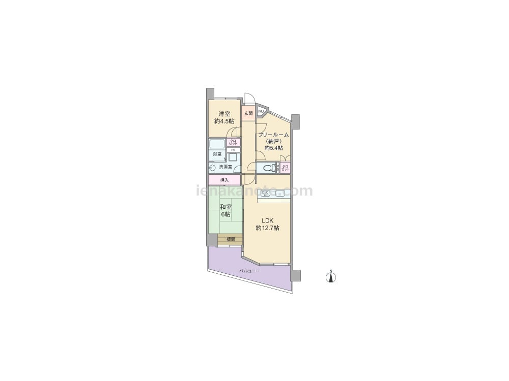 専有面積67.02平米の2SLDK。LDKは約12.7帖、キッチンは作業をしながら家族とコミュニケーションが取りやすい対面カウンタータイプ。和室6帖には板間があります。各居室に収納スペース付き。フリールーム約5.4帖は居室や書斎、ホビールームなど色々な用途に使えそう。バルコニー約10.71平米は一部出幅があります。