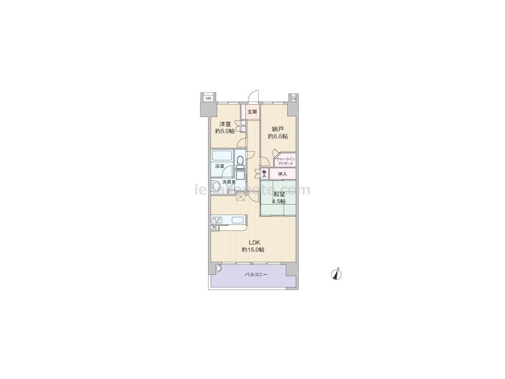 専有面積71.16平米の2SLDK。LDKは約15.0帖、キッチンは料理をしながら家族とコミュニケーションが取りやすい対面カウンタータイプ。和室4.5帖は室内廊下とLDKの2カ所から出入りでき、LDK側の襖を開放すれば、約19.5帖大の空間としても使用出来ます。納戸約6.6帖にはウォークインクロゼットがあり、室内廊下や洗面室にも物入付き。バルコニーにはスロップシンクが付いており、汚れ物を洗ったり、ガーデニングに便利です。