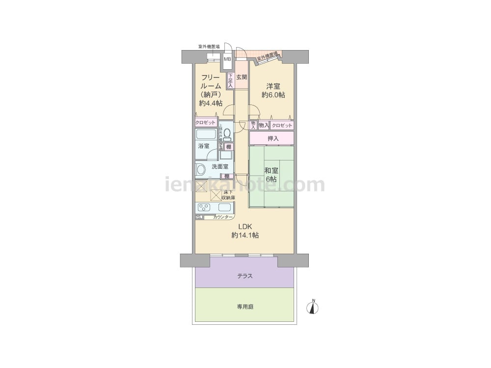 専有面積69.27平米の2SLDK。専用庭付きプラン。LDK約14.1帖に隣接する和室の襖を開放すれば、空間をより広々と使う事が出来ます。和室は室内廊下からも出入りでき、来客時の客間にもぴったり。対面・カウンタータイプのキッチンは洗面室へ出入りが可能な2WAY動線です。収納が各所に設けられているのもポイント。専用庭でガーデニングを楽しんだり、テラスにテーブルセットを置けばカフェ気分を味わえます。