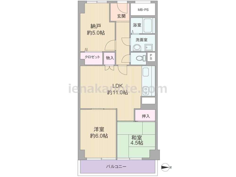 専有面積63.25平米の2SLDK。玄関扉は防犯性にすぐれた内開き型です。キッチンは開放的なI型のウォールタイプ。LDKと洋室約6.0帖の引き戸を開放すれば約17.0帖の一室にプラン変更が可能。ただ、洋室約6.0帖にはクロゼットが無いため場合により家具の配置が必要です。納戸約5.0帖は洋室仕様+収納スペース付きで居室として十分に利用できます。