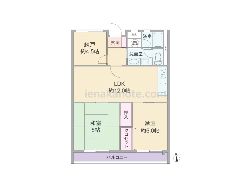 専有面積64.8平米の2SLDK。センターリビングのプラン。LDKは約12.0帖、キッチンは開放的なI型のウォールタイプ。和室8帖と洋室約6.0帖はLDKを通って行き来するため、家族のコミュニケーションの機会が増えそうです。納戸約4.5帖は収納スペース、書斎、ホビールームなど色々な使い方が出来ます。トイレは洗面室を通って出入りする造り。浴室の窓は換気がしやすく快適です。