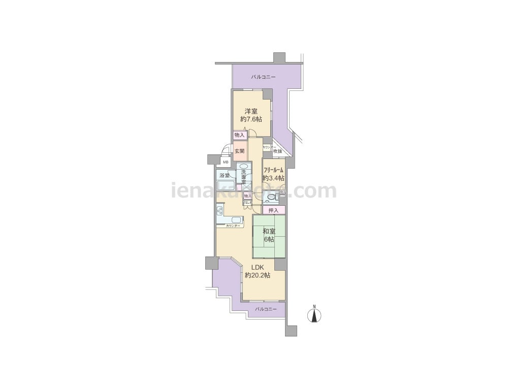 専有面積80.43平米の2SLDK。南北両面にバルコニーがあるセンターインのプラン。玄関正面には吹抜に面したカウンターがあります。LDKは約20.2帖大とゆとりあり、キッチンはL字型の対面式。和室6帖はくつろいだり、小さい子供の遊び場・お昼寝スペースによさそう。フリールーム約3.4帖は書斎、ホビールーム、収納スペースなど色々な使い方が可能です。トイレ内に手洗いカウンター付き。バルコニーは約32.75平米と大変広く、ガーデニングを楽しんだり、テーブルセットを置いて景色を眺めながら食事やティータイムを過ごすのにぴったりです。