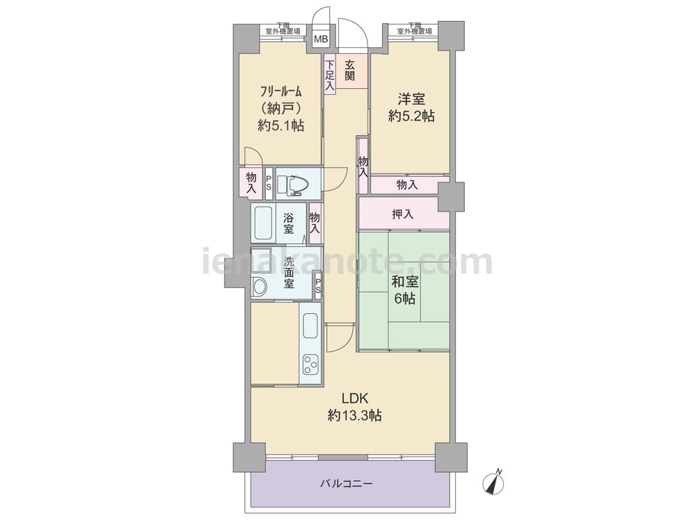 専有面積73.81平米の2SLDK。横長リビングのプラン。和室6帖はLDKと室内廊下の2カ所から出入りでき、LDK側の襖を開放してLDKの一部にしたり、来客時には廊下から出入りする客間にするなど、色々な使い方が可能です。独立型のキッチンはリビング・ダイニングに生活感が伝わりにくく、キッチン横には洗面室への扉もあります。各居室と室内廊下に収納スペース付きです。