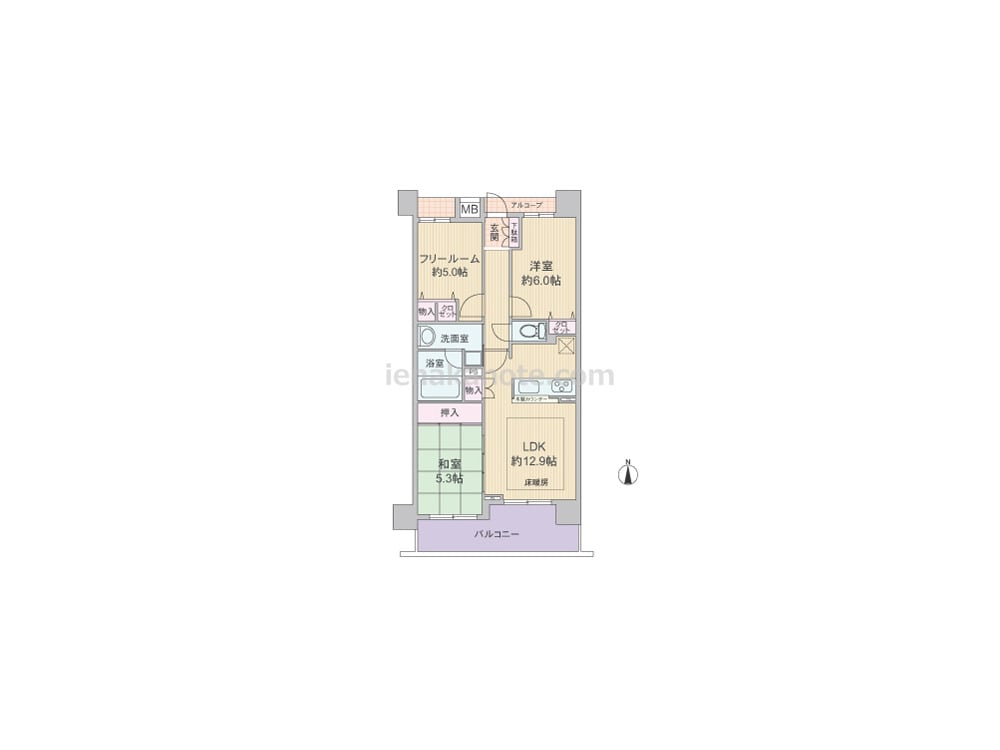 専有面積66.07平米の2SLDK。玄関前にはアルコーブ付き。LDKに隣接する和室の襖を開放すれば、約18.2帖大の家族団欒のリビングスペースになります。カウンタータイプのキッチンは家事をしながら家族とコミュニケーションが取りやすい配置。フリールームは洋室仕様のため、居室としても十分使えます。室内に柱の出っ張りがないため、室内空間を有効的に利用できます。各室に収納が設置され、リビングにも便利な物入付きです。