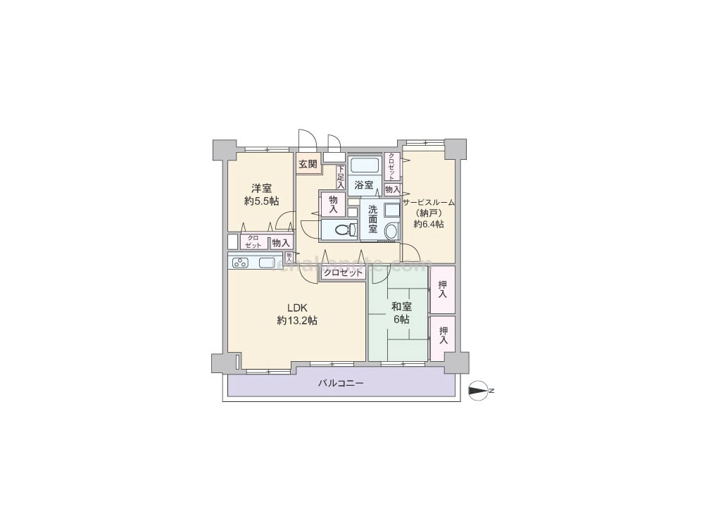 専有面積76.54平米の2SLDK、ワイドスパンのプラン。LDKは約13.2帖あり、キッチンは壁付け・オープンタイプでリビングダイニングを有効に使える配置。どの部屋も独立した配置で家族間のプライバシーを保つ事が可能。サービスルーム(納戸)約6.4帖は、洋室仕様+収納スペース付きのため居室としても十分に使用できます。収納スペースが豊富に設けられ、バルコニーは約12.46平米の広さがあります。