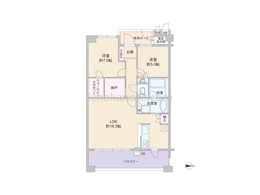 専有面積71.11平米の2SLDK。玄関前にトランクルームと専用ポーチがあります。LDKは約18.3帖、オープンキッチンはリビング・ダイニングを見渡せる対面式。キッチン横にバルコニーへの勝手口があり、洗面室へはLDKを通って行き来します。収納が各所に設けられ、大容量のウォークインクロゼットや納戸があるのもポイント。バルコニー約13.6平米には洗い物やガーデニングでの利用に便利なスロップシンクが付いています。