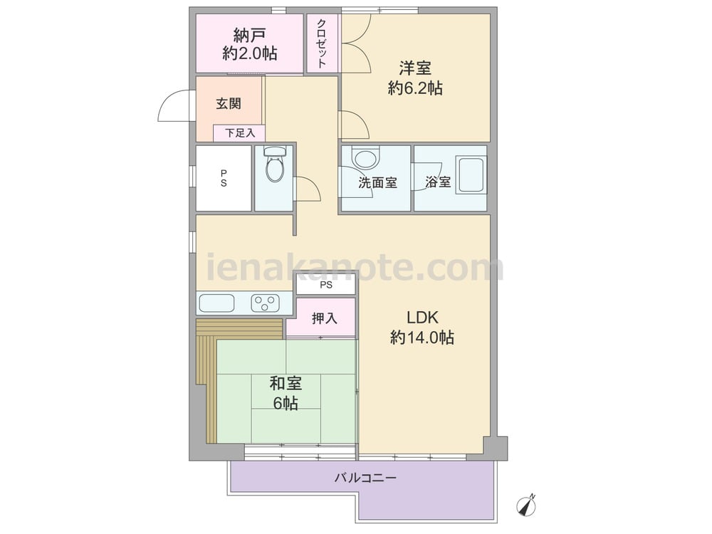 専有面積77.1平米の2SLDK。どの部屋も6帖以上の広さが確保されたプラン。LDKは約14.0帖、キッチンは独立型で、キッチンには換気窓が付いています。和室の板間は家具を置くのに便利。LDKと和室の引き戸を開放して1SLDKに利用してもよさそうです。各居室に収納があり、玄関横に納戸約2.0帖があるのもポイント。バルコニーは一部出幅があります。