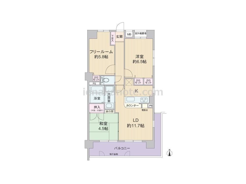 専有面積61.31平米の3LDK。リビング・ダイニング約11.7帖には和室4.5帖が隣接しており、引き戸を開放すれば空間を広々と使う事が出来ます。キッチンは作業中も家族と会話を楽しめる対面カウンタータイプ。キッチン横に窓があり、換気がしやすく快適。キッチンと洗面室の距離が近い家事動線の良い造りです。フリールーム約5.8帖のは容量は少ないですがクロゼットもあり、居室としても十分に使用可能。バルコニーは約12.36平米あります。