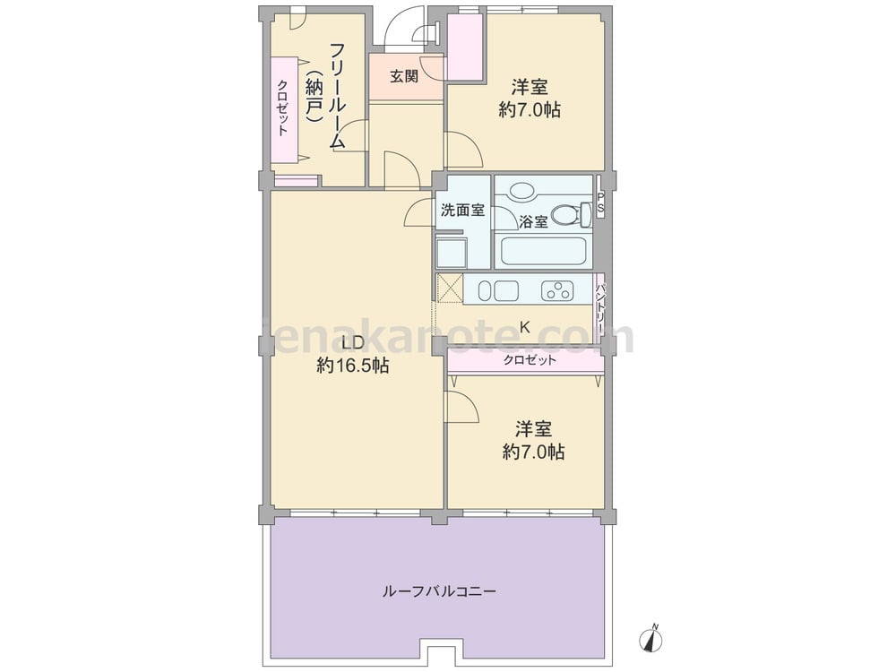 専有面積89.51平米の2SLDK。生活感の出やすいキッチンはリビング・ダイニングから奥まって配置され、キッチン横のパントリーは食料品や調理機器を収納するのに便利。玄関横の洋室約7.0帖にはクロゼットが無いため、家具の設置が必要かもしれません。フリールームは洋室仕様+収納スペース付きで居室にも使える一室です。トイレと浴室はホテルライクな一体型。ルーフバルコニーは約30.53平米と広く、テーブルセットを置いてカフェテラスにしたり、ガーデニングを楽しむのにもぴったりです。