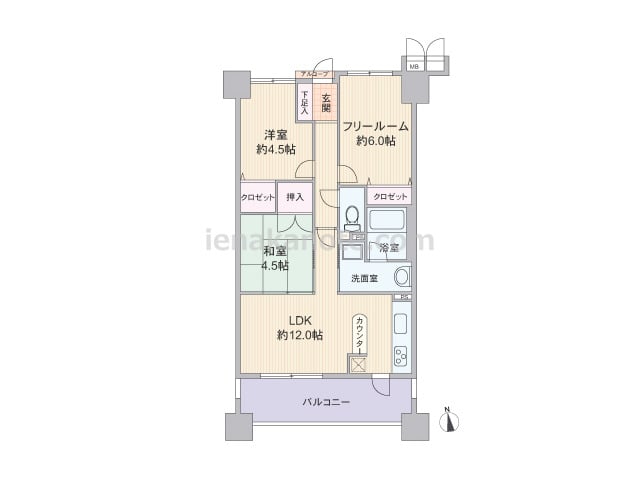 専有面積60.48平米の2SLDK。玄関前にアルコーブ付き。LDKは12帖、キッチンは壁付けタイプで、使い勝手の良いバックカウンターが付いています。キッチン横にはバルコニーへ出られる勝手口があり、家事効率が良いです。リビングと和室は続き間...