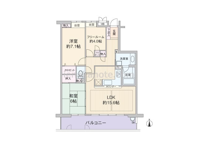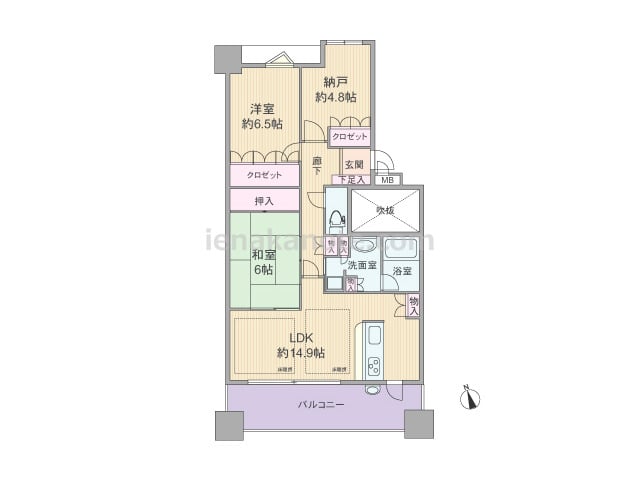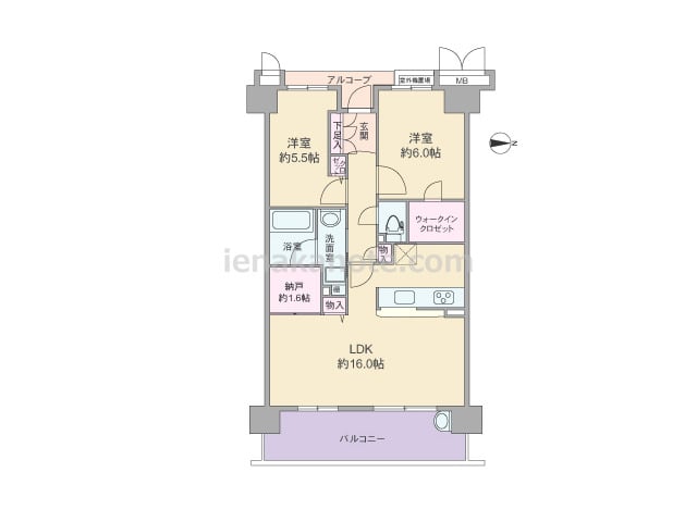 専有面積63.69平米の2SLDK。玄関前にはアルコーブ付き。キッチンはカウンタータイプで、家事をしながら家族の様子を窺うことができます。リビングには物入と約1.6帖の納戸があり、約6.0帖の洋室にはウォークインクロゼットと収納が豊富です。