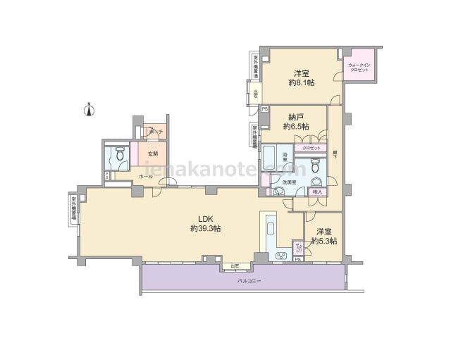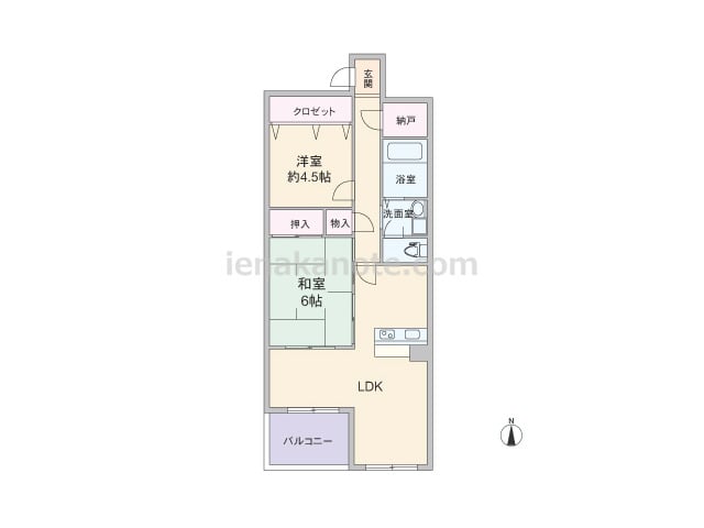 専有面積75.42平米の2SLDK。センターインのプラン。キッチンはバルコニーに面して配置され、勝手口と物入付き。勝手口を出て、すぐのバルコニーには便利なスロップシンクがあります。各部屋に収納スペース付き。和室は扉が二カ所にあり、客間とし...