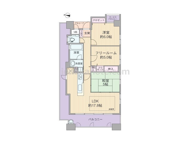 専有面積66.08平米の2SLDK。玄関前にアルコーブがあり、共用廊下に直接面する居室の無いプライバシー重視のプラン。バルコニーは広々L字型で、物干しスペースに困らないのはもちろん、ガーデニングなどを楽しめるゆとりがあります。LDKは17...
