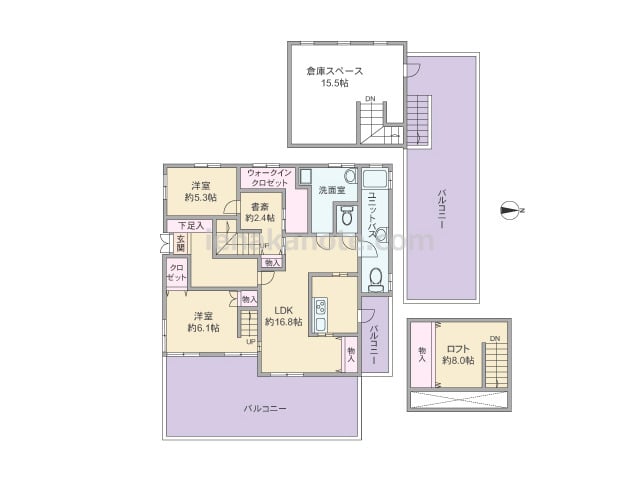 専有面積90.86平米の2SLDK。メゾネットタイプで、各フロアそれぞれに出幅のあるバルコニーとルーフバルコニー付き。二面採光の主寝室は約8.1帖大で、ロフト付き。家事動線に配慮されたツーウエイのキッチンには便利なキッチンバルコニーがあり...