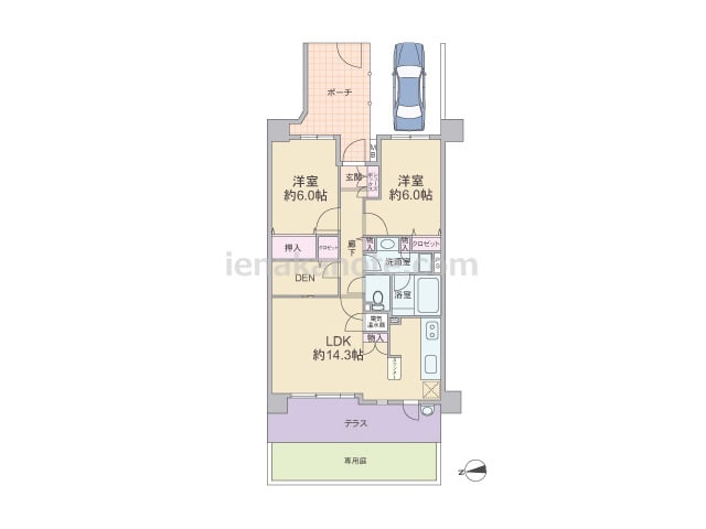 専有面積63.83平米の2SLDK。玄関前に広々とした専用ポーチと専用駐車場、LDKに面してテラスと専用庭がある一戸建て感覚のプラン。キッチンはテラス側にあり、便利な勝手口付き。廊下とリビング・ダイニングからアクセスできるDENは、収納ス...