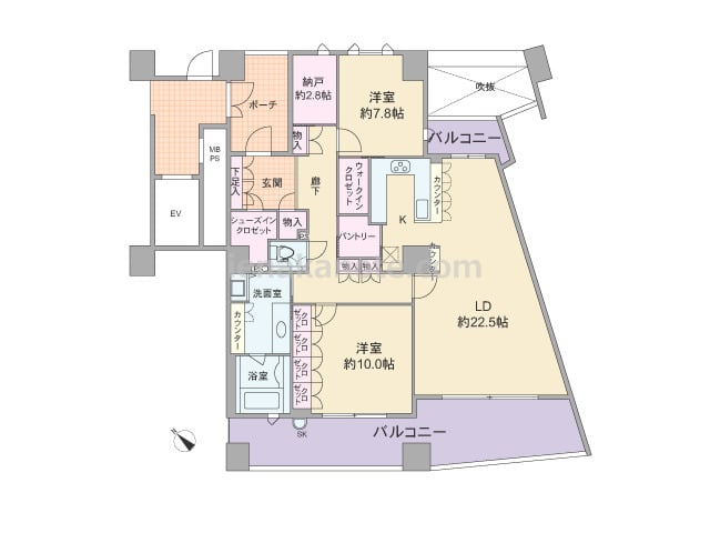 専有面積126.00平米の2SLDK。南西・北東両面バルコニー付き。玄関前にはポーチがあり、プライバシーに配慮されています。LDは広々約22.5帖、キッチンはカウンタータイプで、家事効率の良いコの字型。南西側バルコニーに面した主寝室は約1...