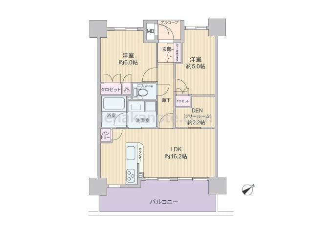 専有面積55.29平米の2SLDK。玄関前にはアルコーブ付き。キッチンはカウンタータイプで、家事をしながら家族の様子を窺うことができます。LDKに隣接して、約2.2帖のDENがあり、趣味の部屋としても収納スペースとしても利用可能。洗面室へ...