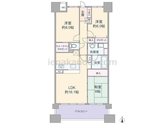 専有面積82.47平米の3LDK。全室6帖以上のゆとりがあるプラン。キッチンはカウンタータイプで、家事をしながら家族と会話を楽しめます。LDKには和室が隣接しており、扉を開放すれば約22.1帖の空間としても利用可能。主寝室約8帖はウォーク...