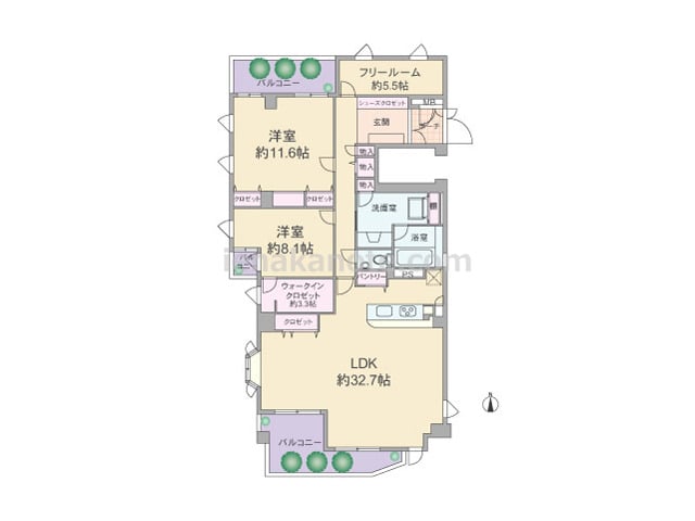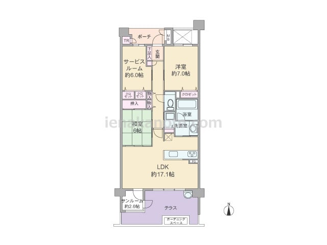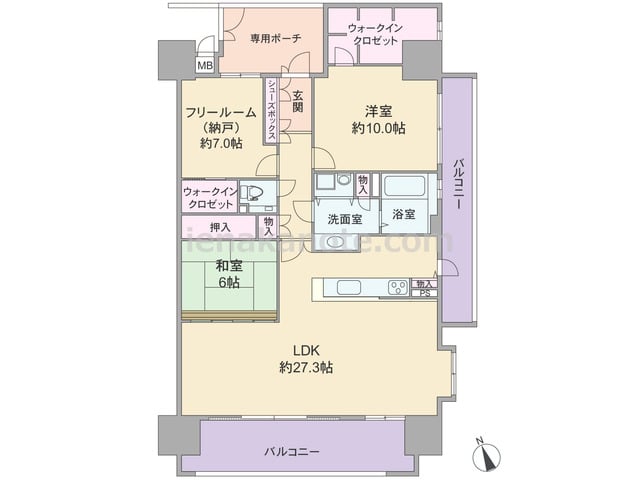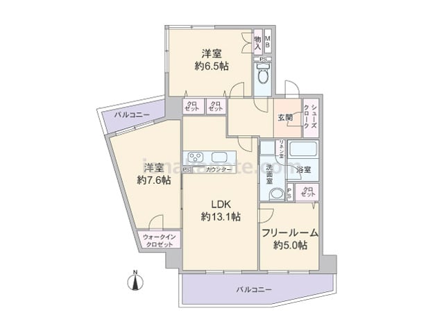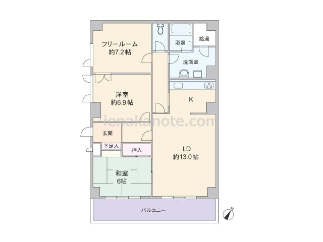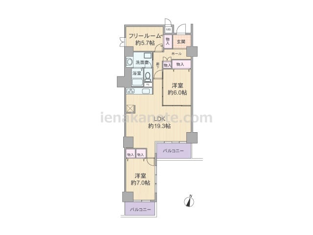 専有面積73.17平米の2SLDK。共有廊下に面した窓が無い、プライバシーが十分に保たれたプラン。キッチンのすぐ横に洗面室があり家事効率の良い配置です。フリールームは書斎や趣味の部屋にしたり、収納スペースがあるので子供部屋に利用してもよさ...