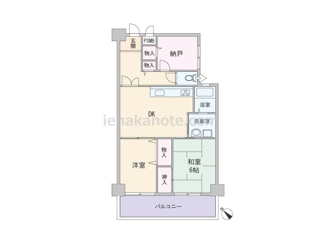 専有面積57.01平米の2SLDK。キッチンは壁付けのオープンタイプ。DKと続き間になった洋室は扉を開放してリビングスペースとして使うこともできます。各部屋に収納が設置されており、納戸は収納としてはもちろん、書斎や趣味のスペースとしても利...