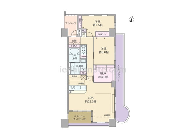 専有面積95.23平米の2SLDK。全室7帖以上のゆとりあるプラン。玄関前にはアルコーブ、バルコニーが2カ所あり、南側のバルコニーはウッドデッキ仕様です。約23.3帖大の広々としたLDKは、2面採光で明るく開放的。カウンタータイプのキッチ...