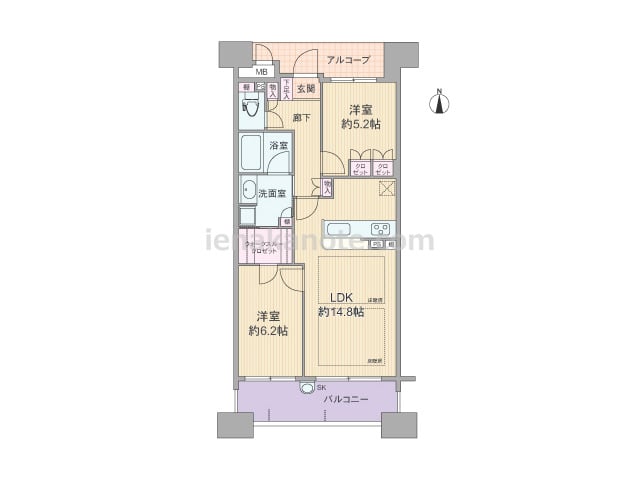 専有面積61.77平米の2SLDK。玄関前のアルコーブにより共用廊下を通行する人の気配を感じにくく、プライバシーに配慮されたプラン。室内に柱の出っ張りが無く、室内空間を有効に使えます。LDKは約14.8帖、カウンタータイプのキッチンは家事...