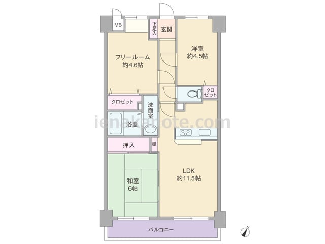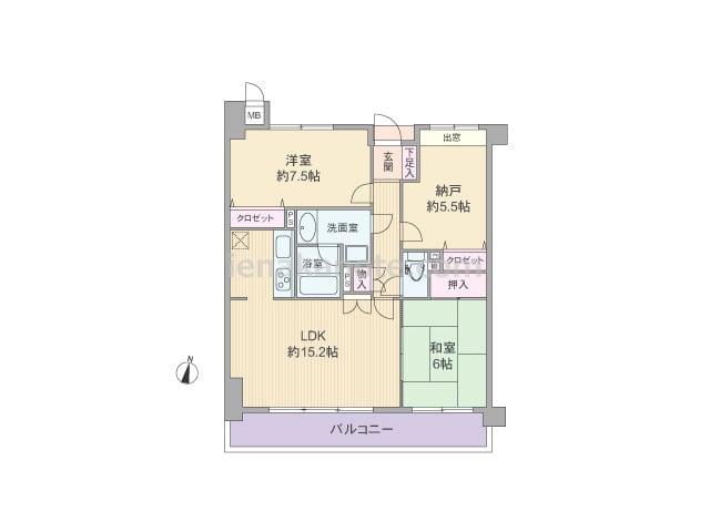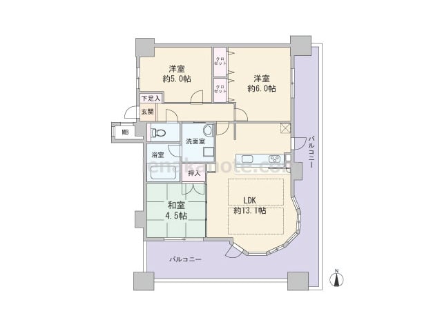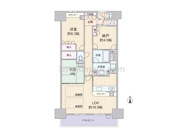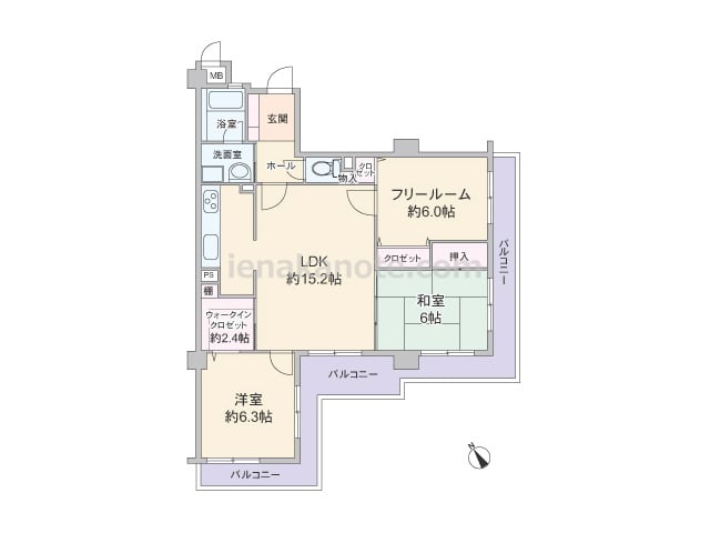 専有面積74.47平米の2SLDK。玄関前にアルコーブ付き。生活感を感じさせやすいキッチンは独立した配置で、リビングダイニングはくつろぎの空間を保つ事が可能。和室6帖は居室に利用したり、襖を開放すれば約18.0帖大のリビングダイニングとし...