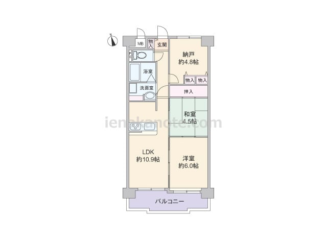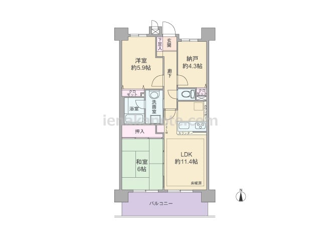 専有面積58.80平米の2SLDK。LDKは約10.9帖、キッチンは家事をしながら家族とコミュニケーションが取りやすいカウンタータイプ。LDK約10.9帖、和室4.5帖、洋室約6.0帖は続き間になっており、扉を開放して空間を広げて使用した...