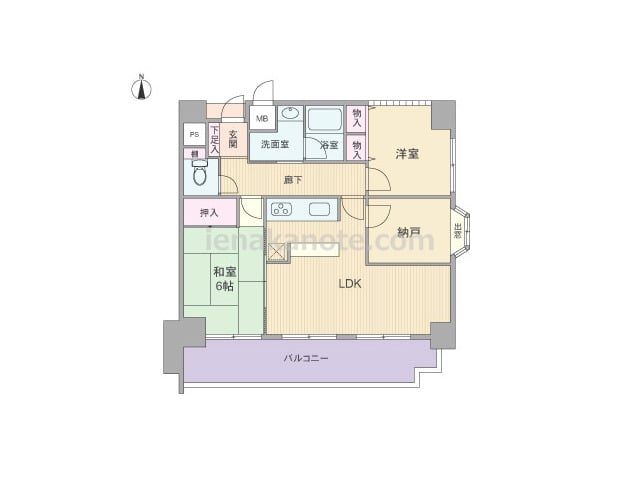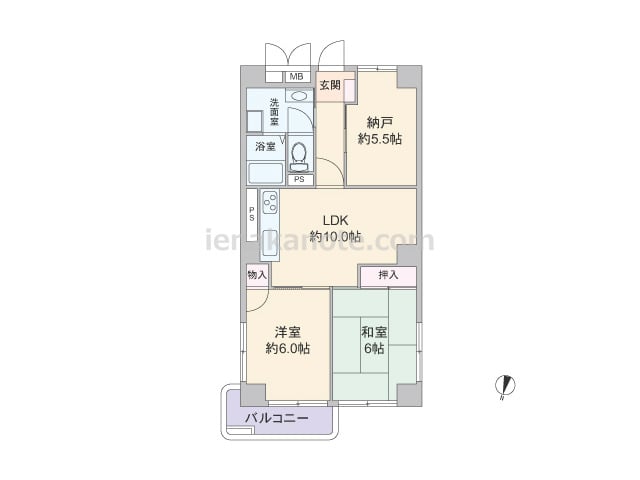 専有面積64.85平米の2SLDK。LDKは約10.0帖、キッチンは壁付け・オープンタイプでリビングダイニングを有効に使える配置。和室6帖と洋室約6.0帖は2面採光。納戸約5.5帖には収納スペースが無いため、収納家具を置くなど少し工夫が必...