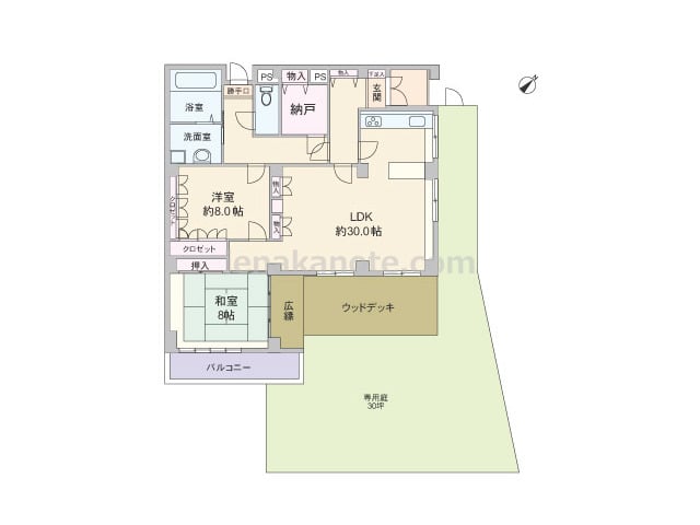専有面積143.73平米の2SLDK。専用庭約30坪が付いた一戸建て感覚のプラン。LDKは約30.0帖大と大変広く、キッチンは奥まって配置されているため、リビングダイニングはくつろぎの空間を保つ事が出来ます。洋室約8.0帖は2カ所から出入...