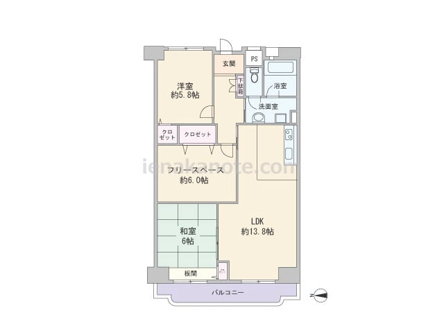 専有面積68.98平米の2SLDK。LDKと和室は続き間になっており、和室はモダンな琉球風畳が用いられています。フリースペースには窓がありませんが、納戸や書斎、趣味の部屋など様々な用途に使える一室。全室に収納が確保されています。浴室に換気...