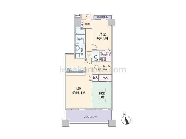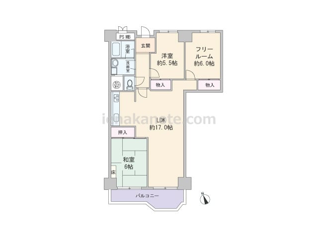 専有面積77.09平米の2SLDK。LDKは約17.0帖大とゆとりがあり、キッチンは壁付け・オープンタイプでリビングダイニングを広く使える配置。和室には家具を置くのに便利な板間付き。フリールーム約6.0帖は洋室仕様+収納付きで、居室に利用...