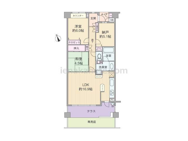 専有面積75.82平米の2SLDK。玄関前にはプライバシーに配慮されたポーチ付き。キッチンはテラスに面して配置された壁付けタイプ。便利な勝手口付き。背面にカウンターなどがあり、リビング・ダイニングからの視線をゆるやかに遮ってくれます。和室...