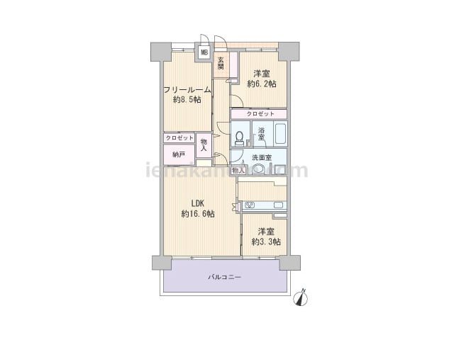 専有面積83.01平米の2SLDK。共用廊下と玄関・居室の窓の間にはアルコーブと吹抜がある、プライバシーを保ちやすいプラン。LDK約16.3帖には開放感のあるFIX窓が用いられています。キッチン背面にはカウンターがあり、洗面室・バルコニー...