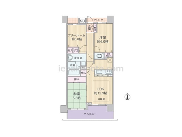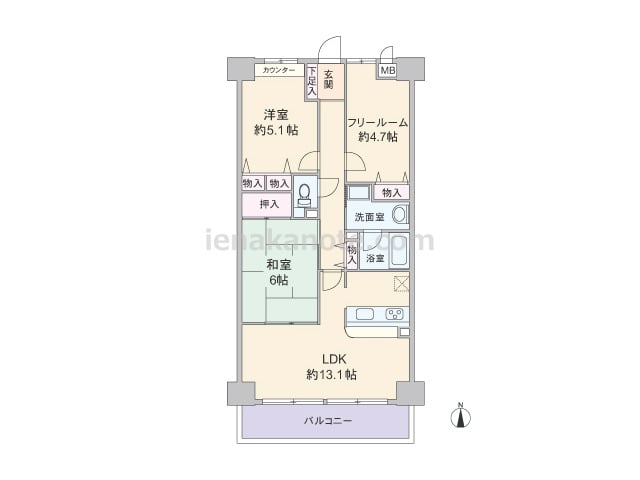 専有面積66.7平米の2SLDK。LDK約13.1帖には和室6帖が隣接しており、襖を開放すれば約19.1帖大の一室としても使用可能。キッチンは作業中も家族と会話を楽しめる対面式です。各居室と室内廊下に収納スペースが設けられ、洋室約5.1帖...