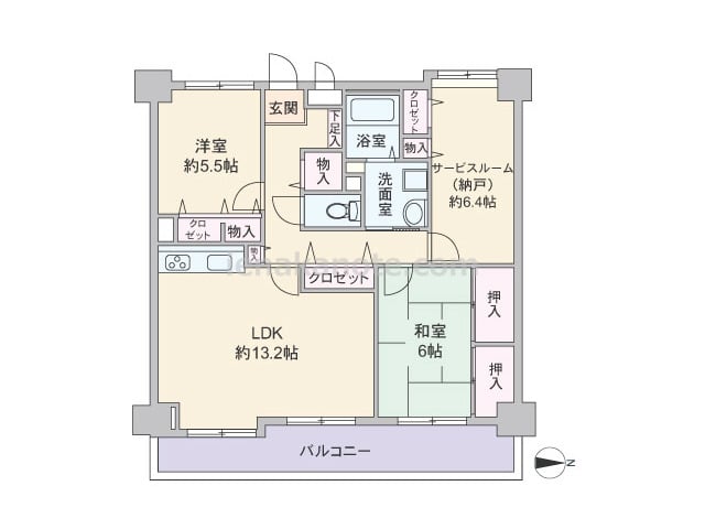 専有面積76.54平米の2SLDK、ワイドスパンのプラン。LDKは約13.2帖あり、キッチンは壁付け・オープンタイプでリビングダイニングを有効に使える配置。どの部屋も独立した配置で家族間のプライバシーを保つ事が可能。サービスルーム(納戸)...