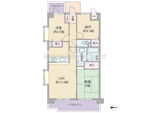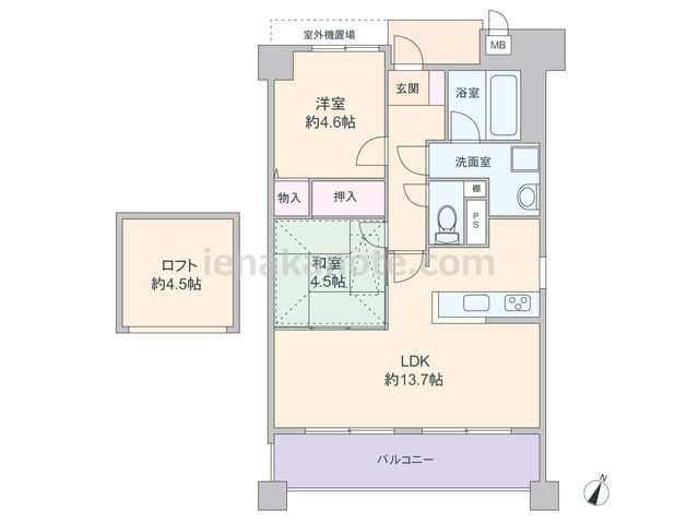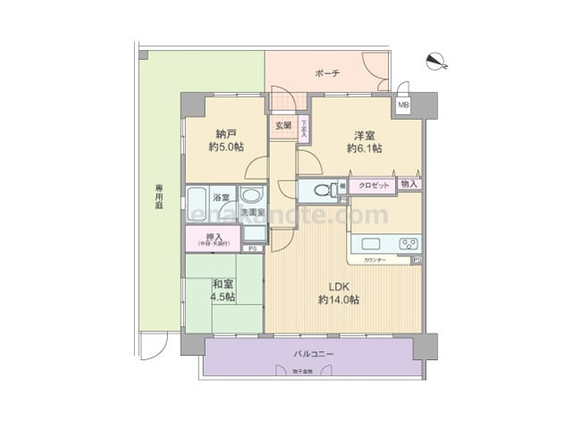 専有面積62.56平米の2SLDK。玄関前には大きなポーチ付き。南側にはL字型の広い専用庭があり、子供の遊び場やガーデニングスペースにもぴったり。共用廊下に直接面した窓がなく、独立感のある部屋。キッチンはカウンタータイプ。リビングには和室...